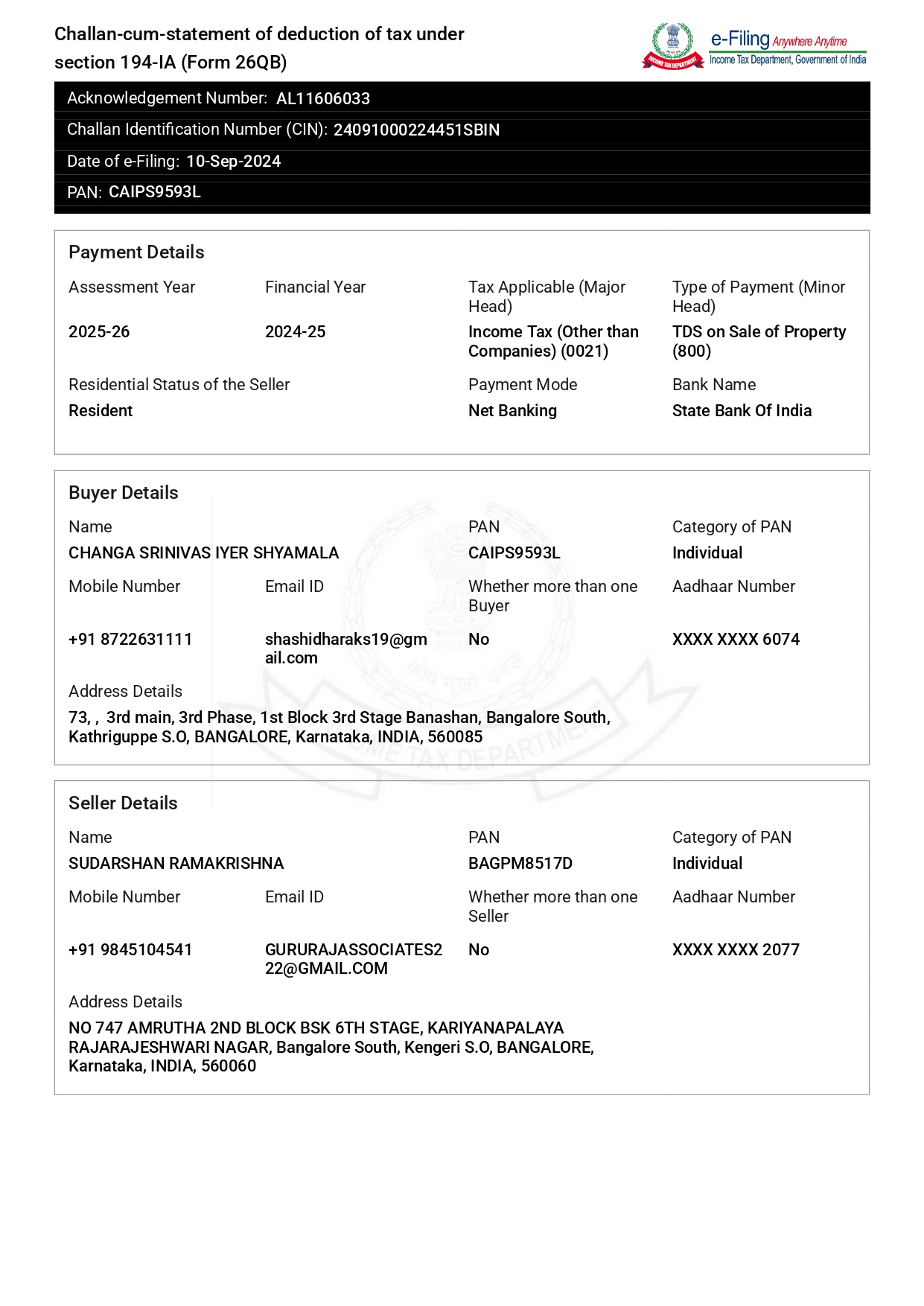 Procedure: We will calculate the tax liability and inform the buyer. Buyer pays tax and handover the receipt to us and we will generate the form 26QB and handover to the customer.